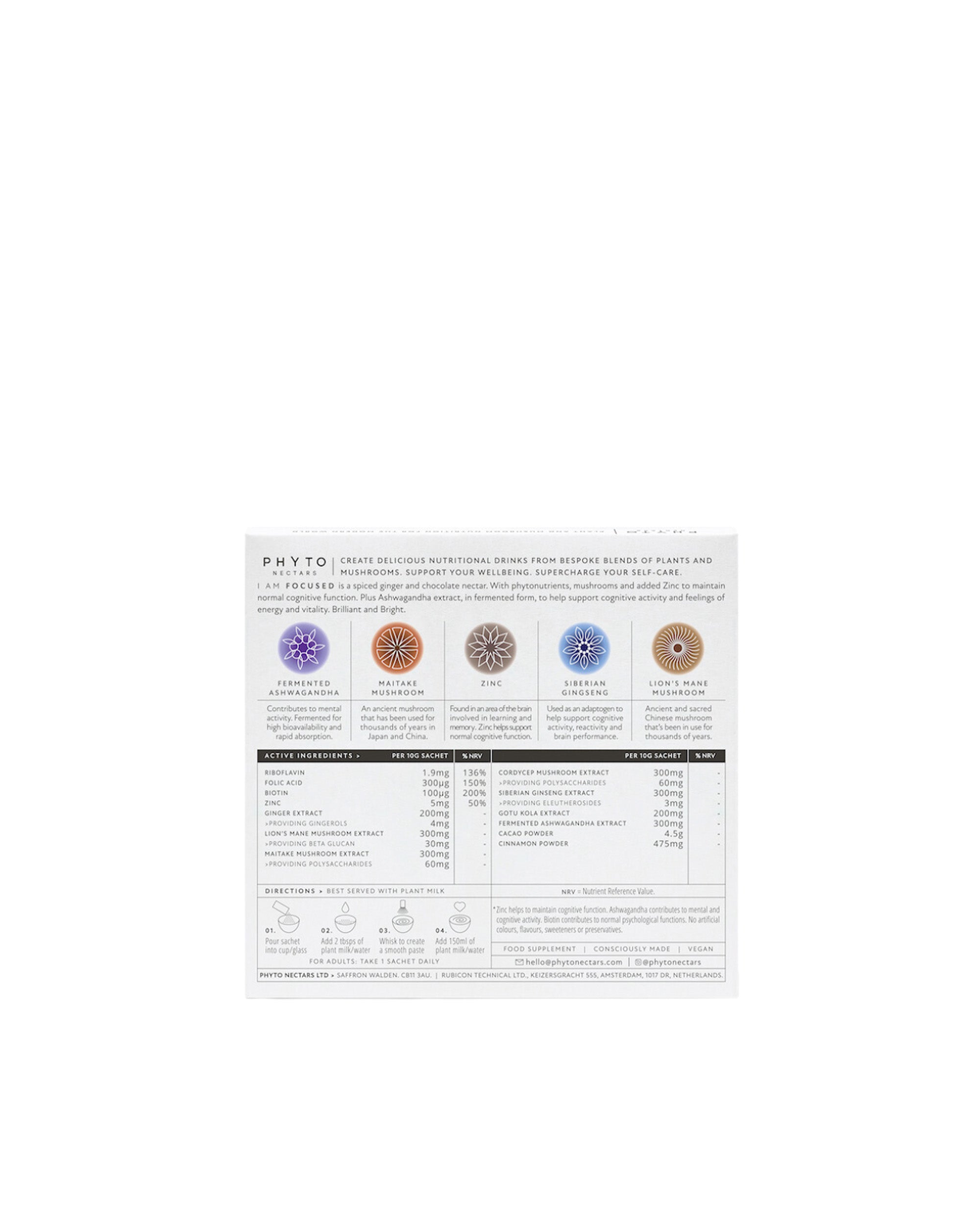 The Brain Drink - “Supercharge Your Mind” with this rich, velvety, spiced chocolate nectar, for cognitive function and clarity. I AM FOCUSED has Lion’s Mane "the brain mushroom", maitake to reduce stress and cordyceps for neuroprotection. Made from a bespoke blend of plants and mushrooms with phytonutrients and added zinc to maintain normal cognitive function. With the addition of a fermented ashwagandha extract, to help support mental activity, increase energy, focus and vitality. Plus, gotu kola, Siberian ginseng and ginger. Get the high without the low.
