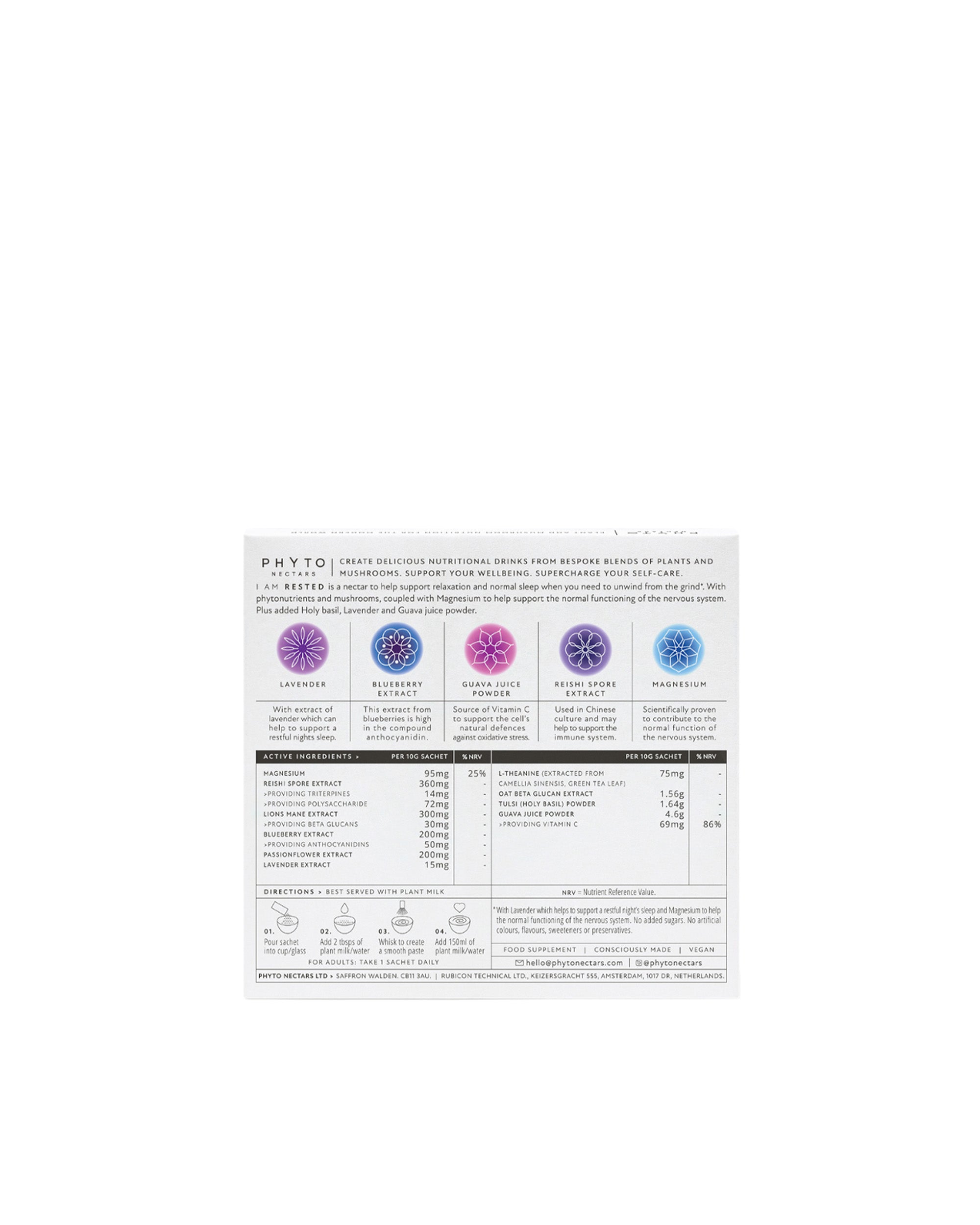 The Calm/Sleep Drink - made from a bespoke blend of plants and mushrooms. I AM RESTED is a calming nectar to support relaxation and help you get a more restful nights sleep. With phytonutrients, mushrooms and added magnesium to aid normal function of the nervous system. Plus L-theanine, passion flower and lavender to aid restful sleep, coupled with Reishi Spore Extract, Lion's Mane, Holy Basil, Blueberry Extract and Guava Juice powder.
